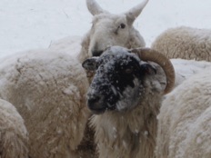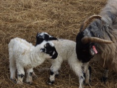 The breeding continues until approximately the third week when the rams are taken from the ewes. The rams are put into very close confinement in a small shed for about 5 or 6 days until they get to know each other again! This prevents them from doing too much damage to each other when they vie for the top ram position! The ewes are still on pasture but are given access to large hay bales if there is snow on the ground. Fresh water is always available and we keep a heater in the tank. The rams are maintained separately with hay, fresh water, salt and minerals and have access to pasture all winter long, with an open fronted shed available for shelter.